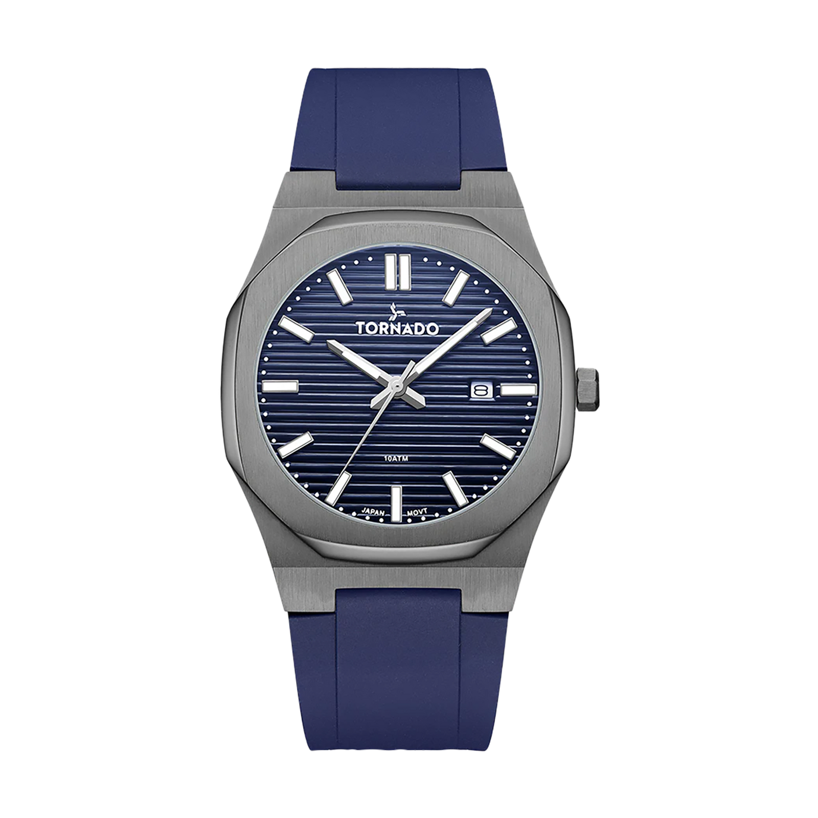 The Tornado SPECTRA in grey and blue offers a calm and contemporary take on a compact sports profile. The 40 mm round case is constructed from solid 316L stainless steel and finished in grey, with an octagonal bezel. The blue dial features a horizontal striped texture that adds depth, accented by luminous hands and index markers that ensure legibility in low light, with the date display set neatly at three o’clock. Sapphire-coated glass protects the dial, keeping the surface clear through regular wear.A high-quality blue silicone strap secured by a butterfly clasp provides flexibility and durability while remaining comfortable on the wrist. Driven by the Japanese Miyota GM10 quartz movement and rated to 10 ATM, the SPECTRA is designed for everyday wear, travel, and light water exposure. Supported by a three-year warranty, it balances a modern aesthetic with practical performance.