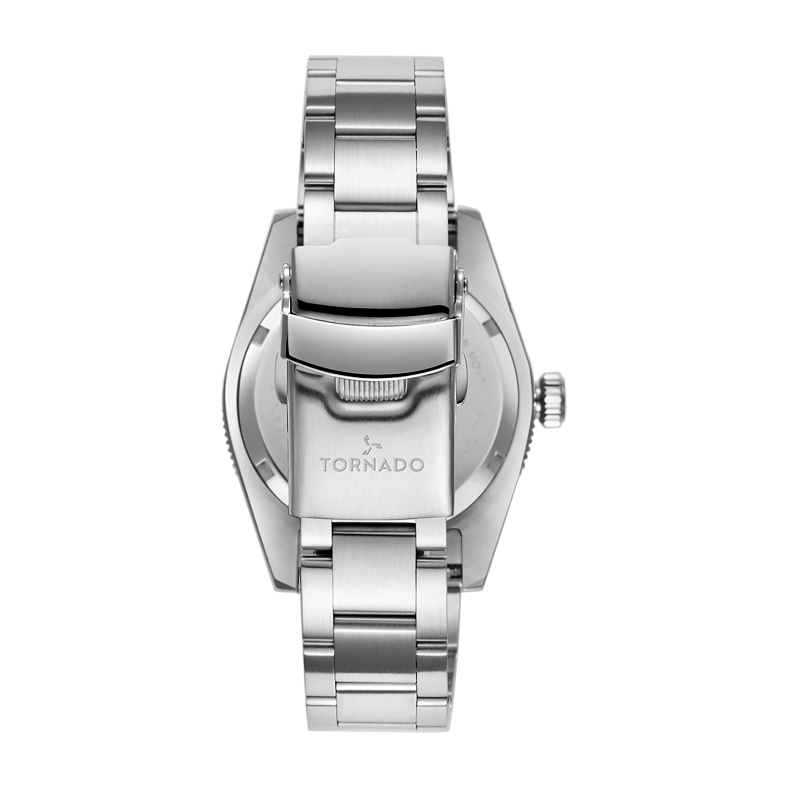 Purposeful and compact, the Tornado LUMINA DATE in silver is built around everyday functionality and proportion. The black dial finished with a fine sand texture keeps reflections in check while subtly adding depth. Luminous markers and hands remain legible after dark, and the date window at three o’clock is cleanly framed for quick reference. The 40 mm round case is cut from solid 316L stainless steel with a vertical brushed finish, enhancing the crisp, utilitarian feel. A unidirectional rotating bi-color aluminium bezel adds a functional edge, reinforcing the watch’s sport-forward character. Sapphire-coated glass protects the dial, maintaining a clear view through daily wear. A matching stainless-steel bracelet continues the brushed finish and tapers from 20 mm to 16 mm, secured with a butterfly buckle for a low-profile fit. At just 9 mm thick, the case sits comfortably on the wrist. Powered by the Japanese Miyota 2315 three-hand quartz movement and rated to 10 ATM, the Lumina Date is backed by a three-year warranty, and delivers the right mix of versatility and sophistication.