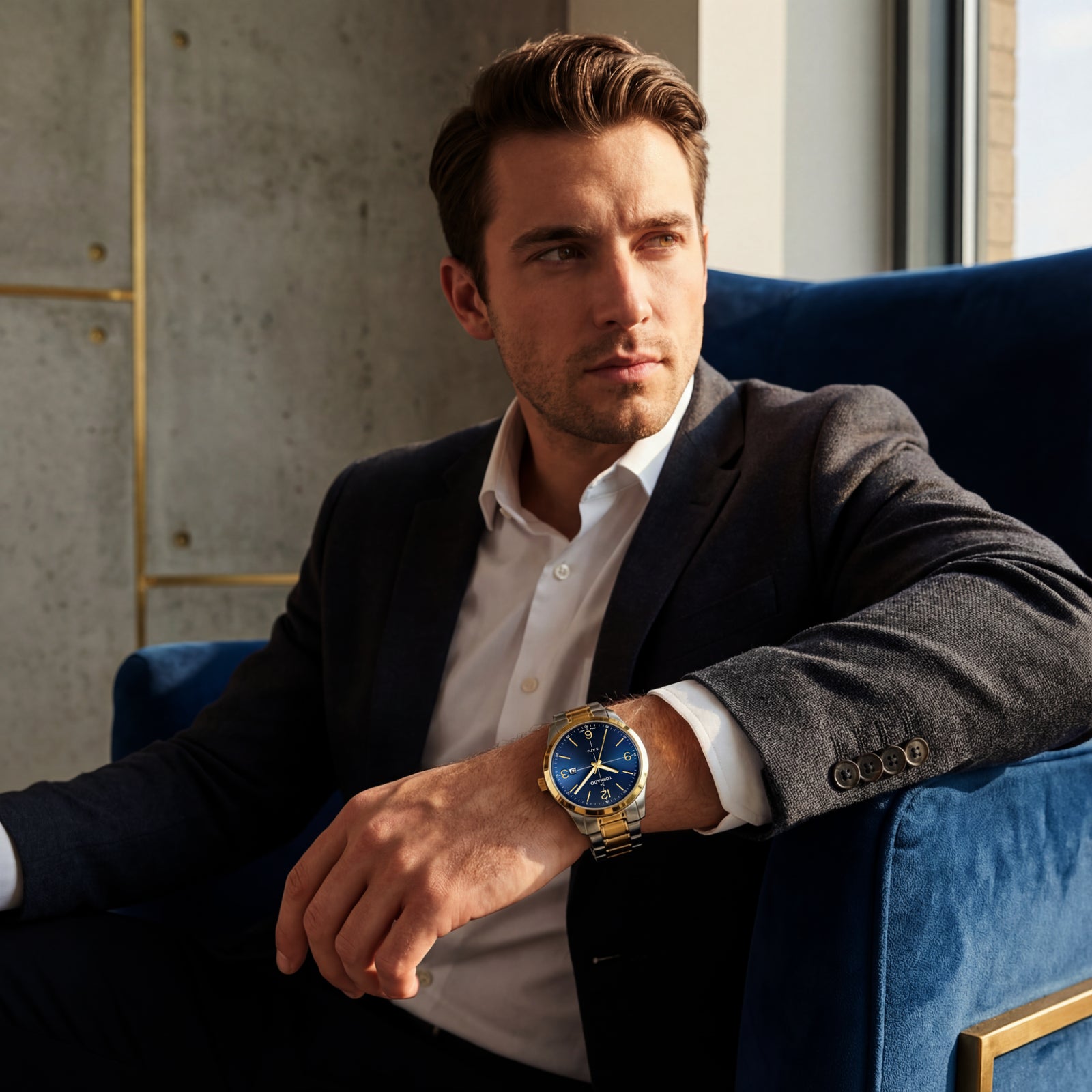This two-tone variant of the TORNADO CLASSIC exudes calm, undeniable presence. The blue dial sits at the centre of the design, rich with a subtle play of light, but kept orderly by clean proportions. Gold-coloured markers stand out clearly against the dial, while the mixed gold and silver hands mirror the case and bracelet without drawing undue attention. The date window at three o’clock is neatly framed and easy to read at a glance.