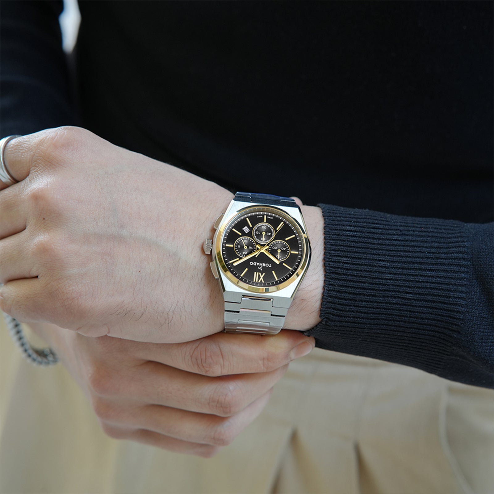 AURORA NOVA Premium multi-function men?s watch with black dial and two-tone gold case. Powered by Miyota JP29 movement, featuring sapphire-coated glass, integrated stainless steel bracelet, butterfly buckle, and 10 ATM water resistance.