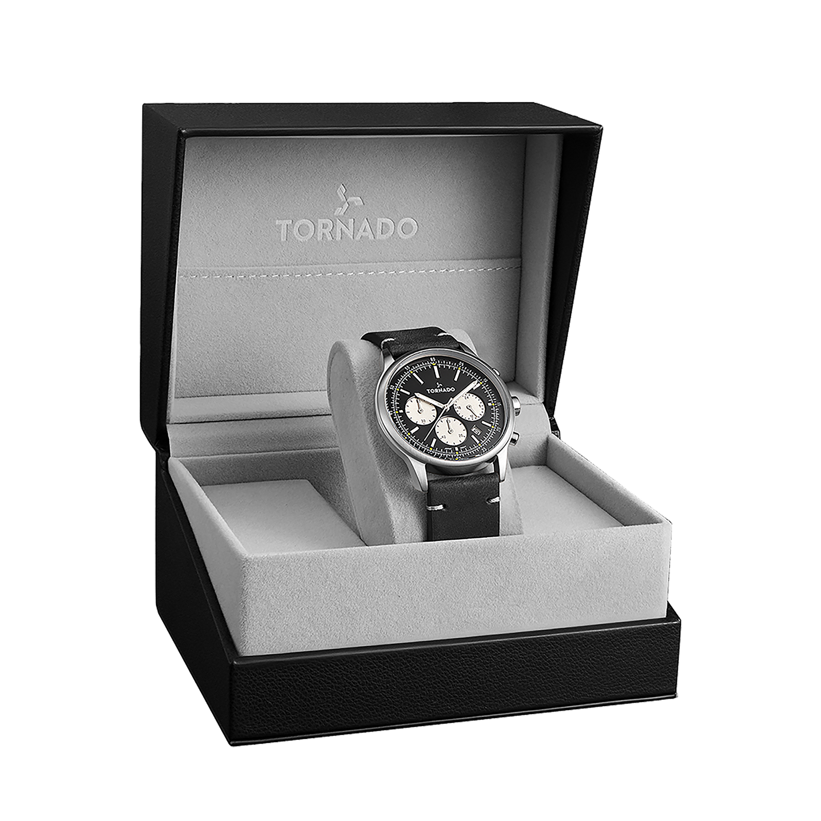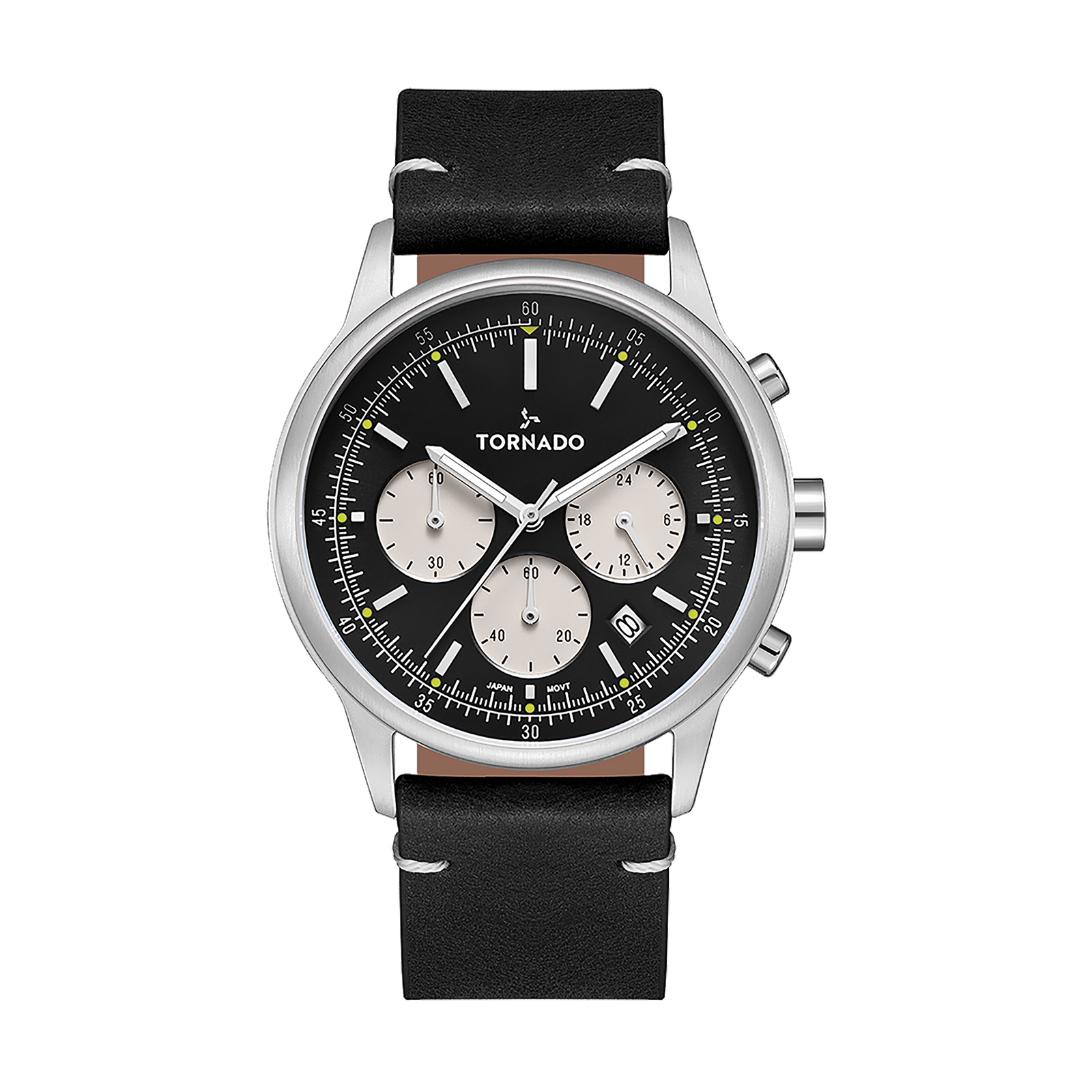 A brushed silver case in 316L stainless steel gives this TORNADO CLASSIC build a clean, restrained presence, with a balanced 42 mm round profile and a measured 12.40 mm thickness. The black sunray dial adds depth through shifting light, while luminous hands and hour markers maintain clear readability without disrupting the dial’s understated tone. The multifunction layout is powered by the Seiko VD53 movement, chosen for steady performance and practical functionality. A sapphire-coated crystal sits above the dial, offering clarity and added surface protection. The watch is fitted with a black genuine leather strap, tapered from 22 to 18 mm and secured with a traditional tang buckle, matching the dial and reinforcing its classic character. Rated at 5 ATM water resistance and backed by a three-year warranty, the piece blends familiar proportions with dependable construction and everyday usability.