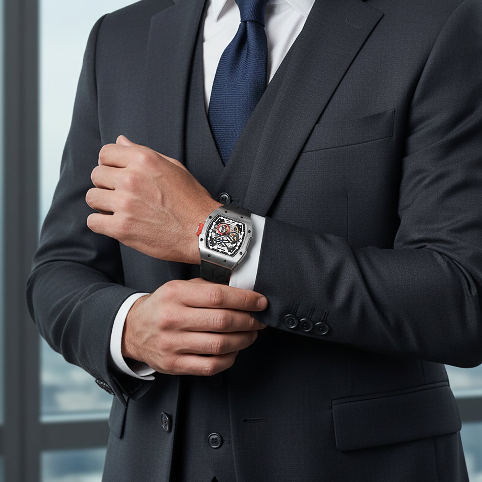 Silver 316L stainless steel meets open-worked engineering in a well-balanced 39 mm tonneau case. The Miyota 82S7 Japanese automatic drives the display under a sapphire-coated crystal; luminous details and a butterfly clasp keep it practical and polished. The black silicone strap is flexible, durable and easy to clean.This men?s automatic watch pairs with shirts and tailoring by day, leather and denim by night. 10 ATM water resistance and a 3-year warranty make it an effortless, enduring pick.