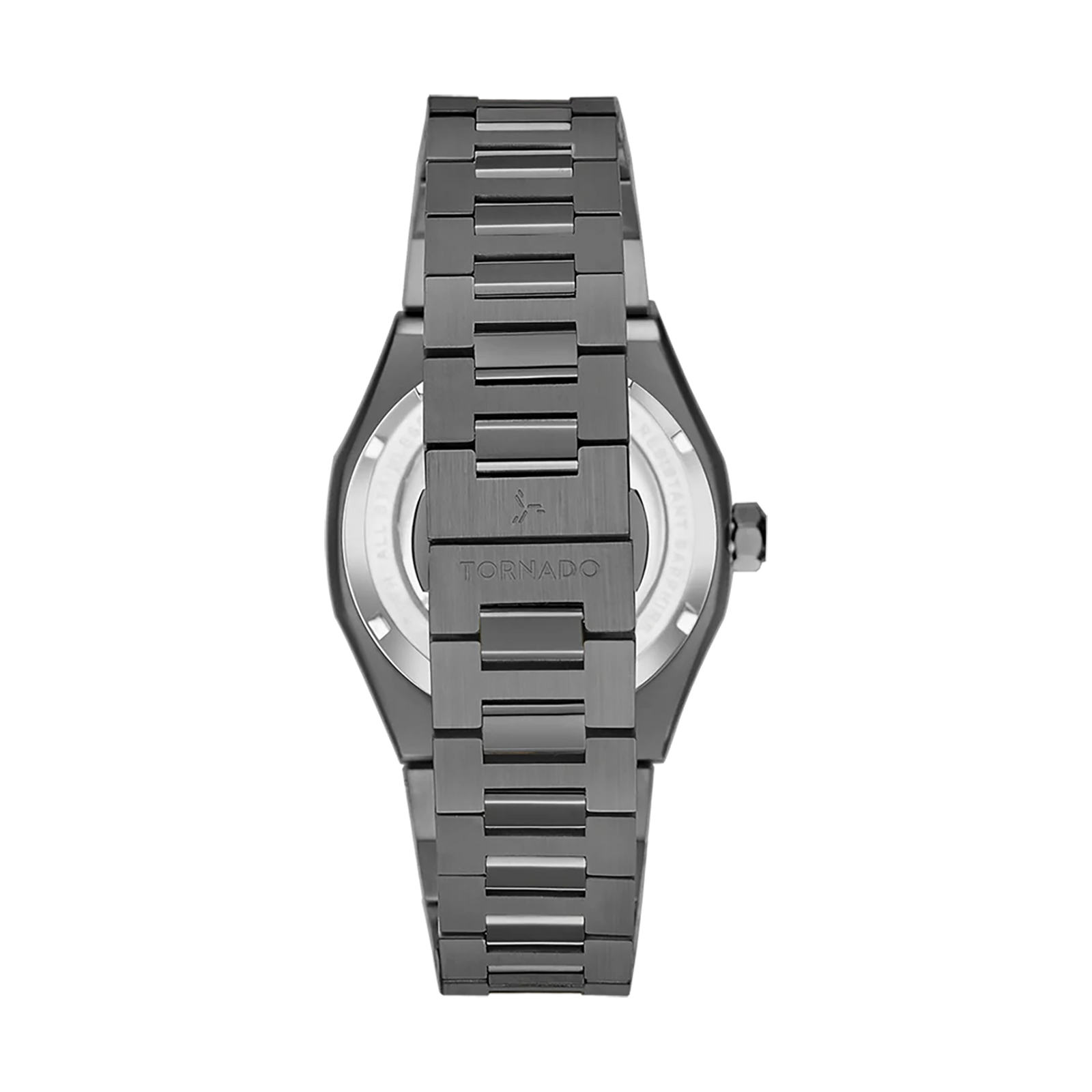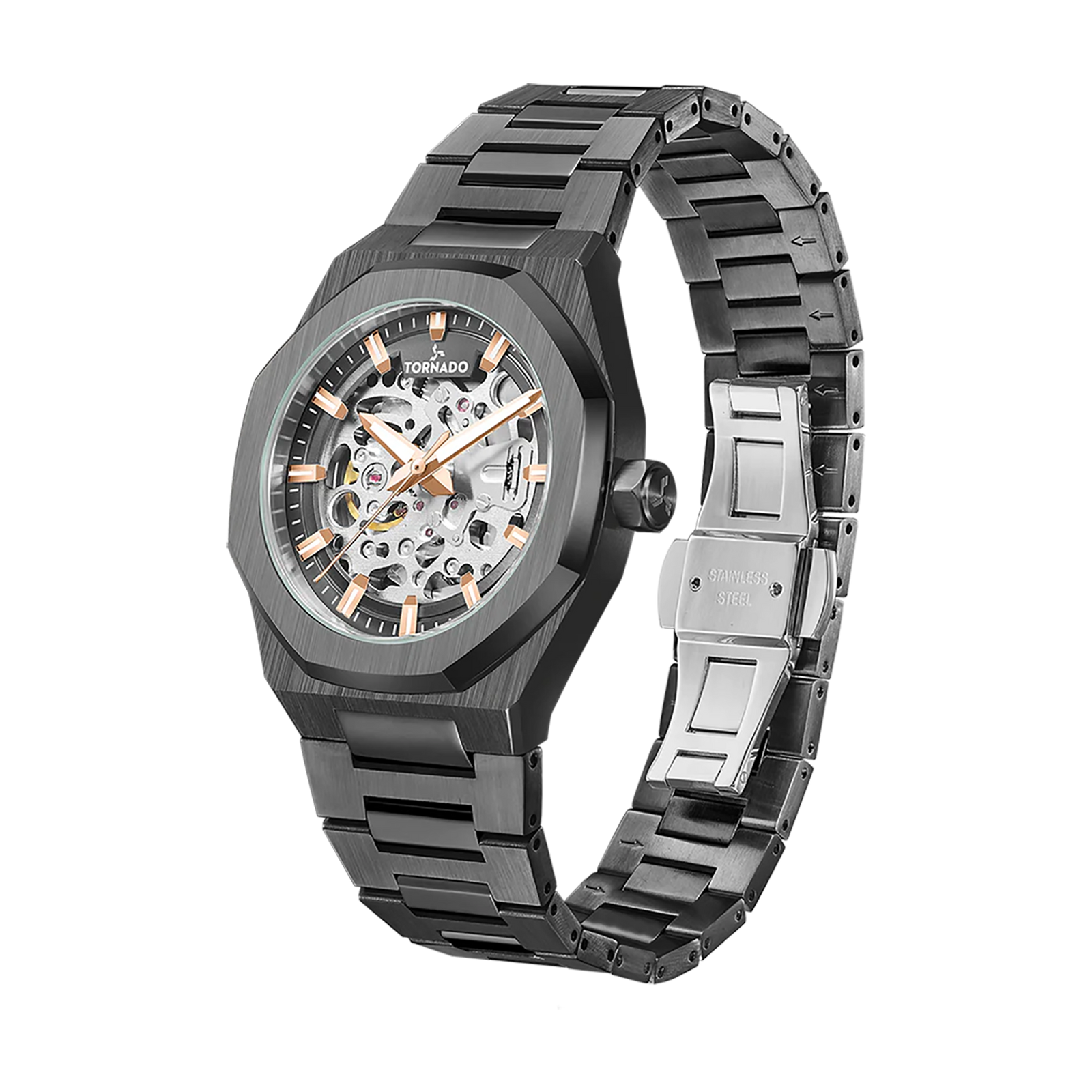 Automatic skeleton watch with grey dial and integrated stainless steel bracelet. Features Seiko NH70 movement, sapphire-coated glass, octagonal bezel, and 10 ATM water resistance.