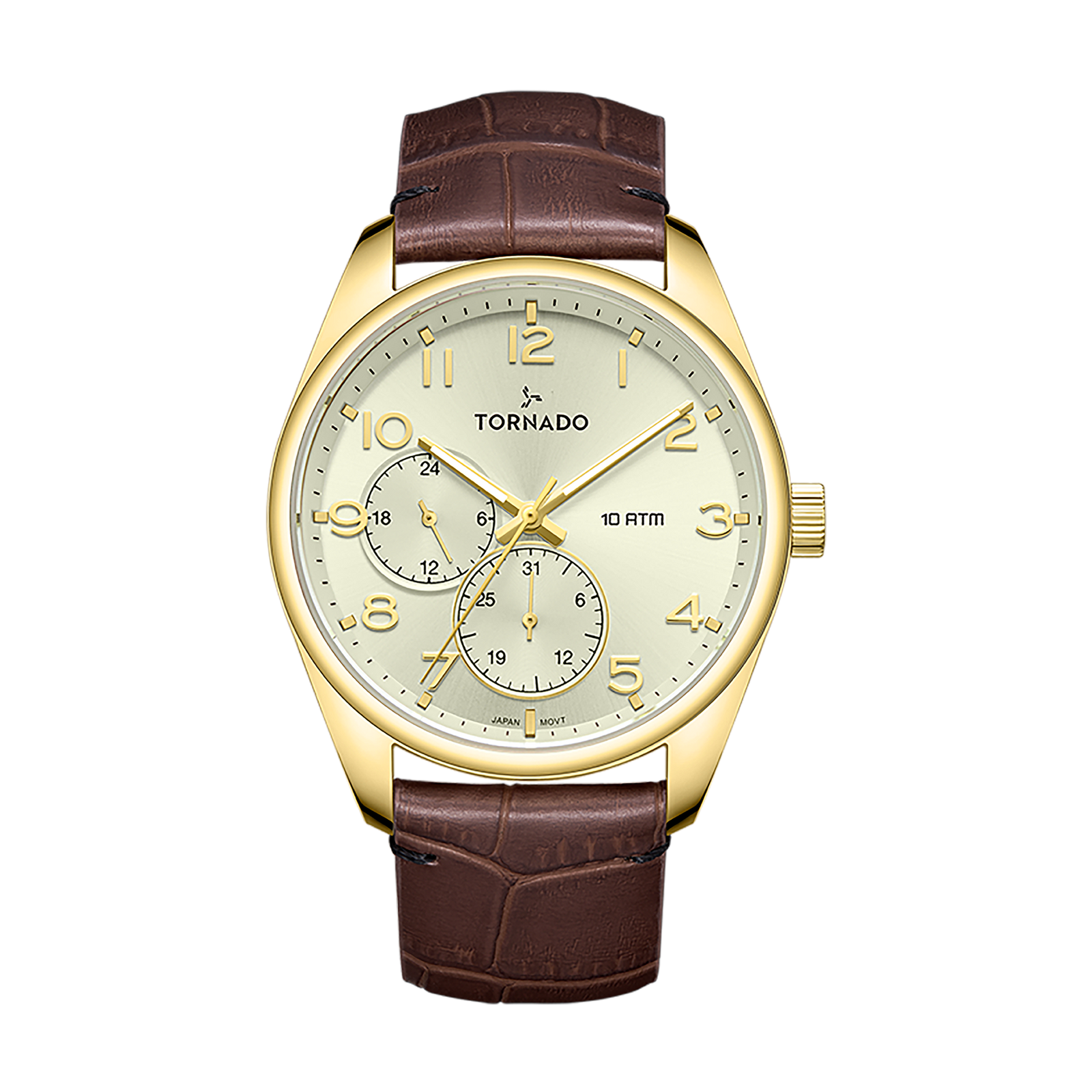 The 42 mm round case of the champagne CELESTIA CLASSIC.avifis rendered in a warm gold tone, formed from solid stainless steel with a soft matte finish that tempers its richness. The proportions give the watch a confident presence while remaining balanced and comfortable on the wrist. A champagne dial with a smooth sunburst texture sits well guarded beneath a sapphire-coated crystal. Bold Arabic numerals provide clear legibility, while the multi-function layout is neatly integrated to maintain an uncluttered, composed appearance. Power comes from the Seiko VX7R quartz movement, delivering dependable timekeeping and consistent multi-function operation. With a water resistance rating of 10 ATM, the watch is well suited to daily wear and moisture contact. The design is completed with a brown genuine leather strap finished in a crocodile pattern, adding contrast and a classic character to the gold case. It fastens with a traditional tang buckle. A three-year warranty backs the build, underscoring its solid construction and long-term reliability.