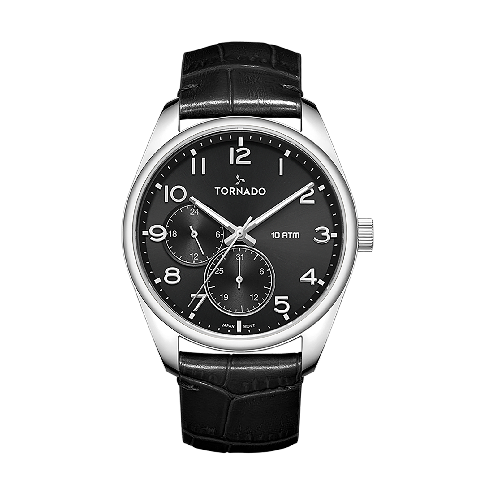 The CELESTIA CLASSIC presents a 42 mm round case crafted from solid stainless steel with a matte silver finish, giving the watch an understated profile suited for daily wear. The black dial features Arabic numerals set against a smooth sunburst surface, allowing light to move subtly across the face while preserving clear legibility. A multi-function layout adds practical depth without overcrowding the dial, maintaining an orderly and refined appearance. Protection comes from a sapphire-coated crystal, chosen for its clarity and resistance to scratches. Inside, the Seiko VX7R quartz movement delivers reliable multi-function performance, supporting consistent timekeeping with minimal maintenance. Water resistance is rated at 10 ATM, for sufficient protection against routine exposure. The watch is fitted with a genuine leather strap finished with a crocodile pattern, reinforcing the classic character. It secures with a traditional tang buckle, reinforcing the watch’s conventional appeal and ease of wear. A three-year warranty completes the offering, underscoring its dependable construction and long-term usability.