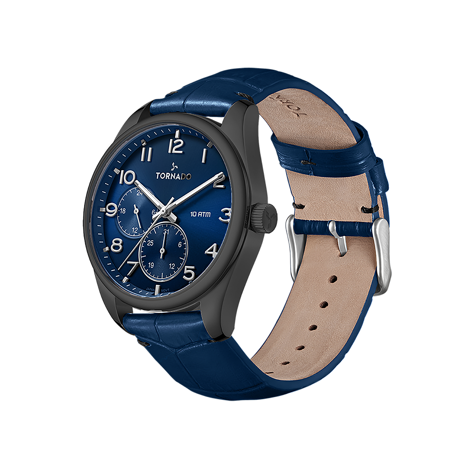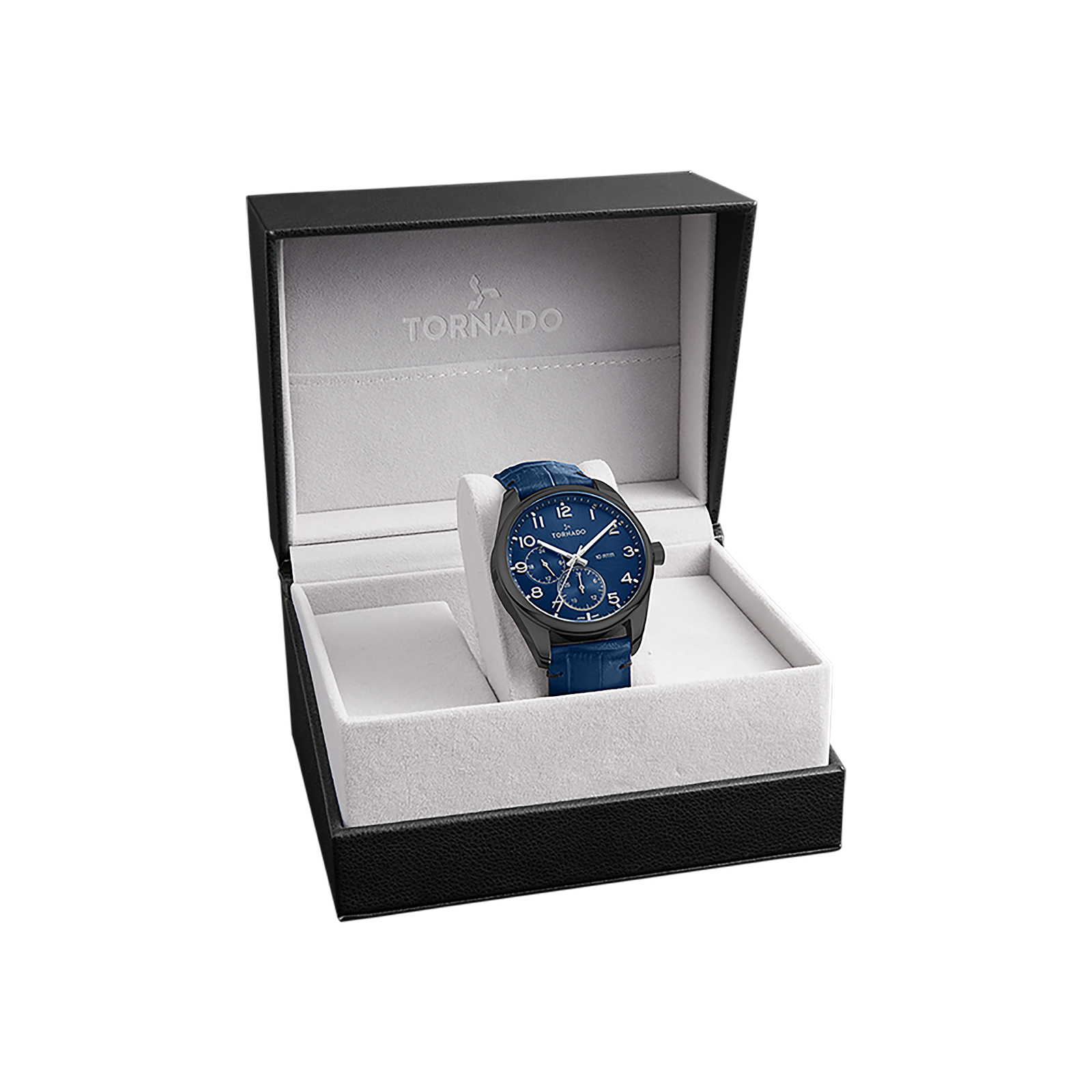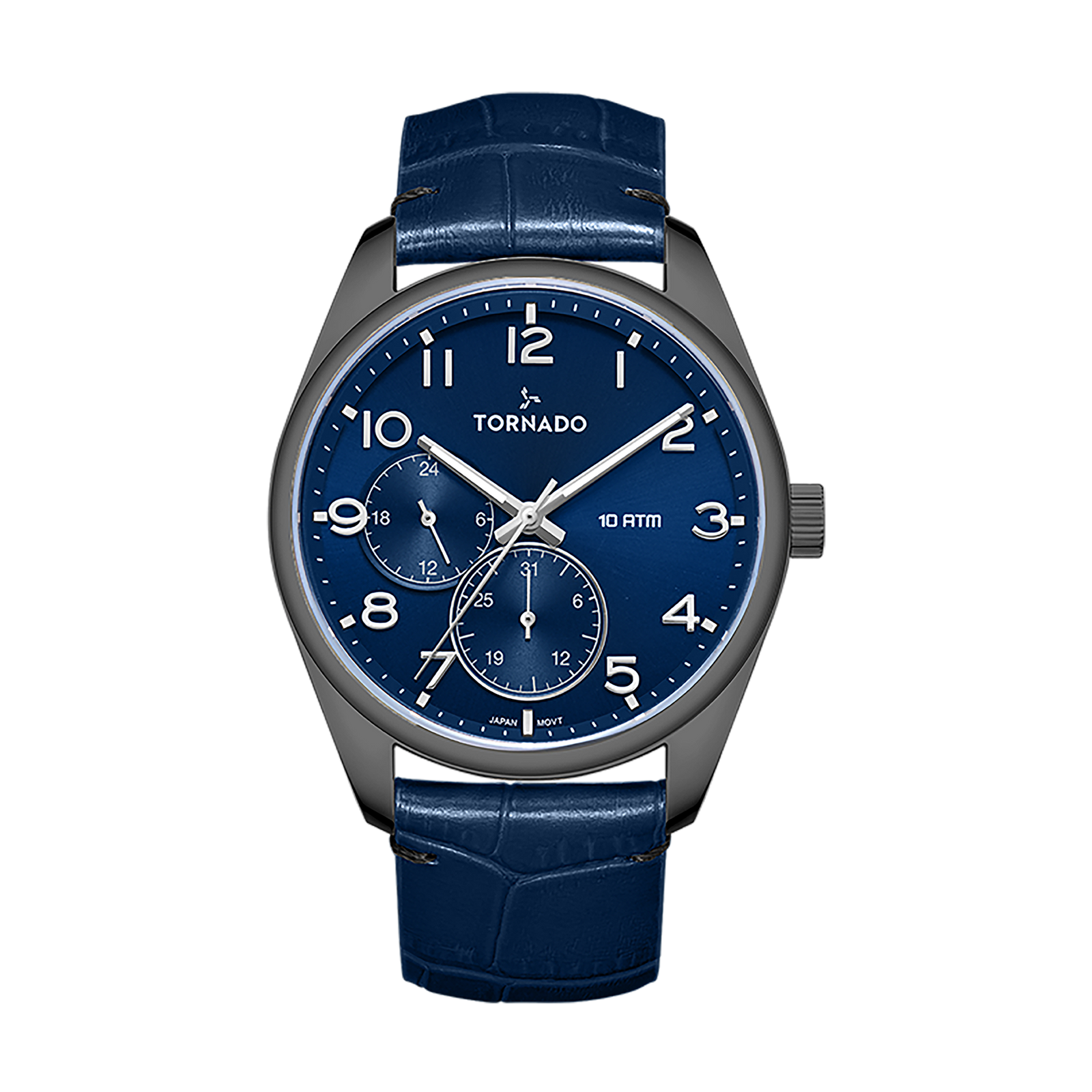 The CELESTIA CLASSIC in blue is built around a 42 mm round case in a muted grey tone, crafted from solid stainless steel with a matte finish for a restrained and contemporary character. The sunburst blue dial forms the visual centre, catching light subtly as the angle changes. Arabic numerals surround the multi-function layout. A sapphire-coated crystal protects the dial, offering added resistance to scratches and cracks. Inside, the Seiko VX7R quartz movement provides proven, capable multi-function performance. The watch is rated to 10 ATM for water resistance, making it suitable for everyday wear, including exposure to water during routine activities. The 28x24mm blue genuine leather strap features a crocodile pattern that adds texture and refinement, paired with a classic tang buckle for a secure and adjustable fit. A three-year warranty completes the package, reflecting the durability and quality of construction.