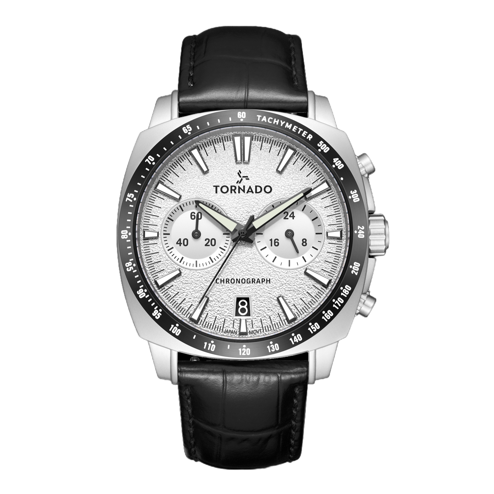 This Tornado chronograph blends classic design language with modern watchmaking . The 42 mm square case is crafted from solid 316L stainless steel and finished in silver, with a rounded bezel that softens the edges. The white dial complements the case and features a matte sand-textured surface with a fine-grain finish. The chronograph layout is practical, and protected beneath a sapphire crystal for prolonged wear resistance. A genuine black leather strap with crocodile pattern adds to the traditional touch, secured with a deployant buckle for comfort and ease of wear.