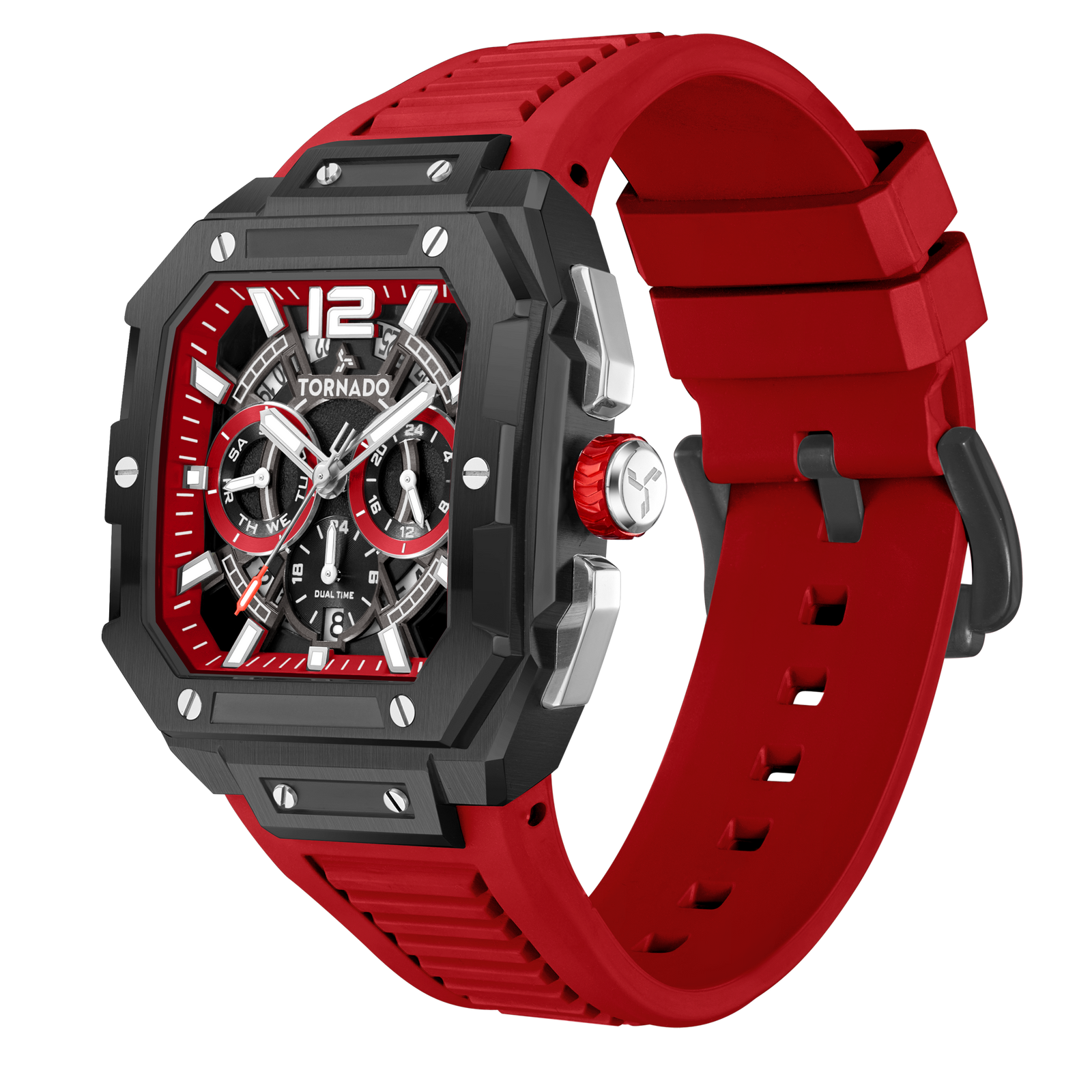 This Xenith Curve packs a 44 mm square case in brushed solid stainless steel, paired with a striking red dial and matching FKM rubber strap. The dial sits beneath sapphire glass for dependable scratch resistance and is powered by a Miyota JP25 multifunction movement, cleanly showcased through a transparent K9 Crystal back case. The red FKM strap adds comfort and extreme durability, secured with a classic tang buckle. Finished with 10 ATM water resistance and backed by a three-year warranty, this watch is all about practicality and toughness, making it a confident choice for those who appreciate vivid colours and a robust build.