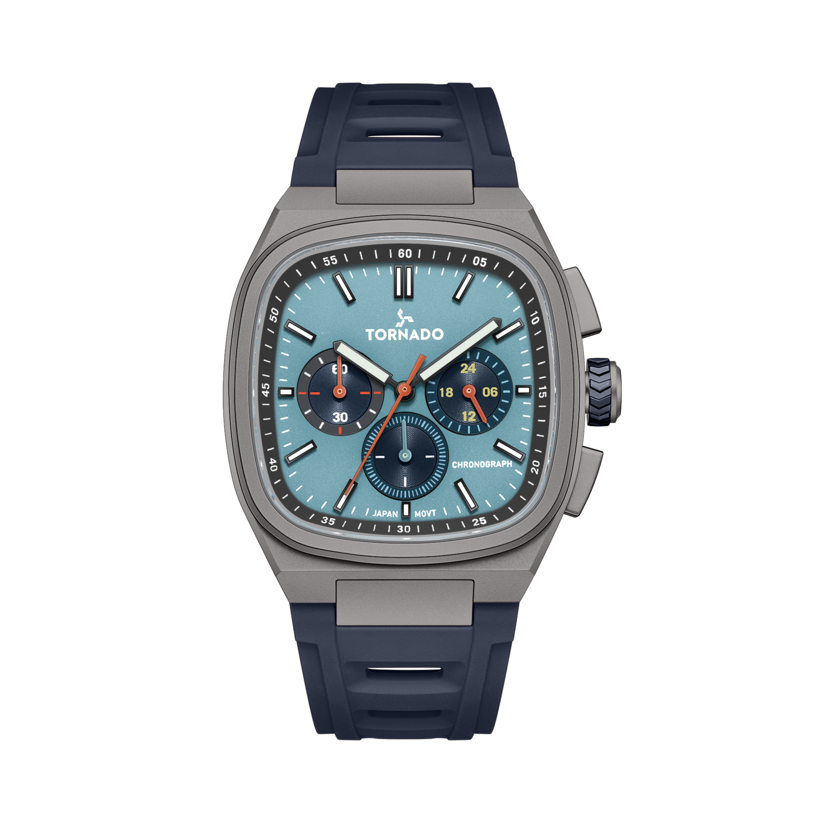 The Aristocrate is built around a compact 42 mm square case made from 316L stainless steel, sporting a tool-watch character finished in black with a sand-blasted surface and scratch-resistant coating. The blue dial matches the blue rubber strap, and is protected by Sapphire glass. The precise chronograph movement is powered by the Seiko VD54 system, while being backed by a 10 ATM water resistance rating and a three-year warranty.