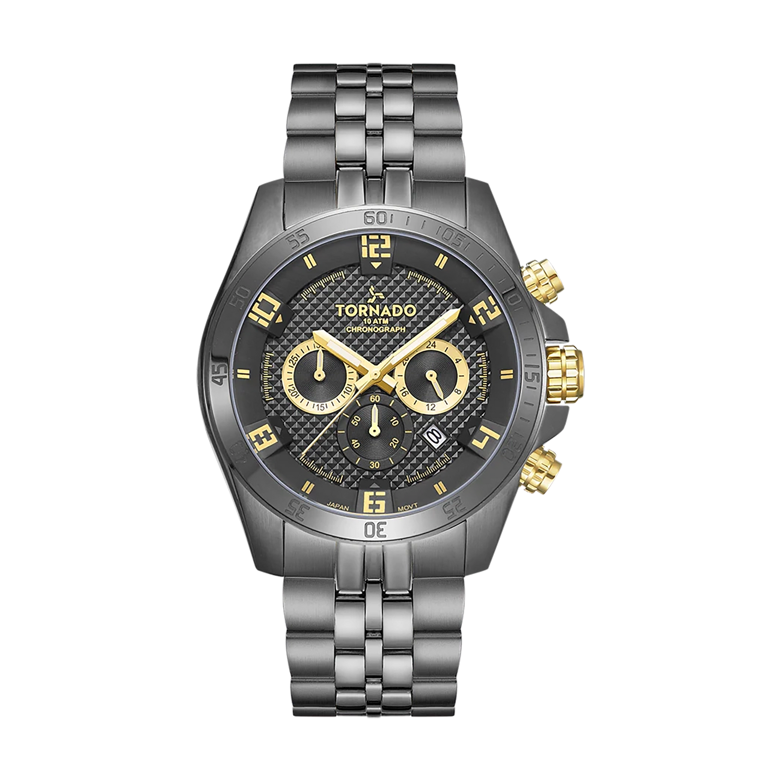 Tornado Celestia Chrono Men's Chronograph Watch with black dial, gunmetal case and strap. Japan Quartz movement, sapphire coated glass, 10ATM water resistant. 3-year warranty included.