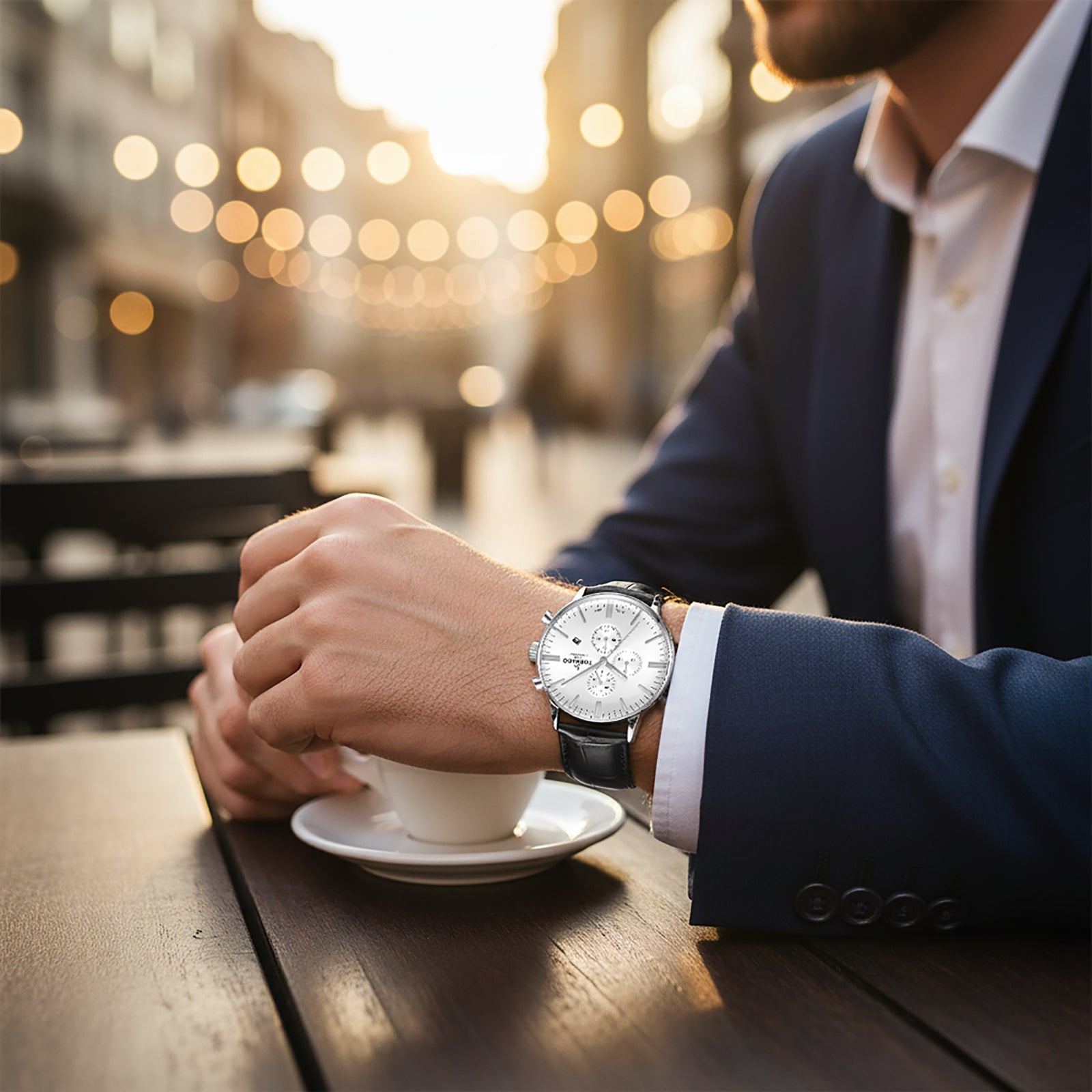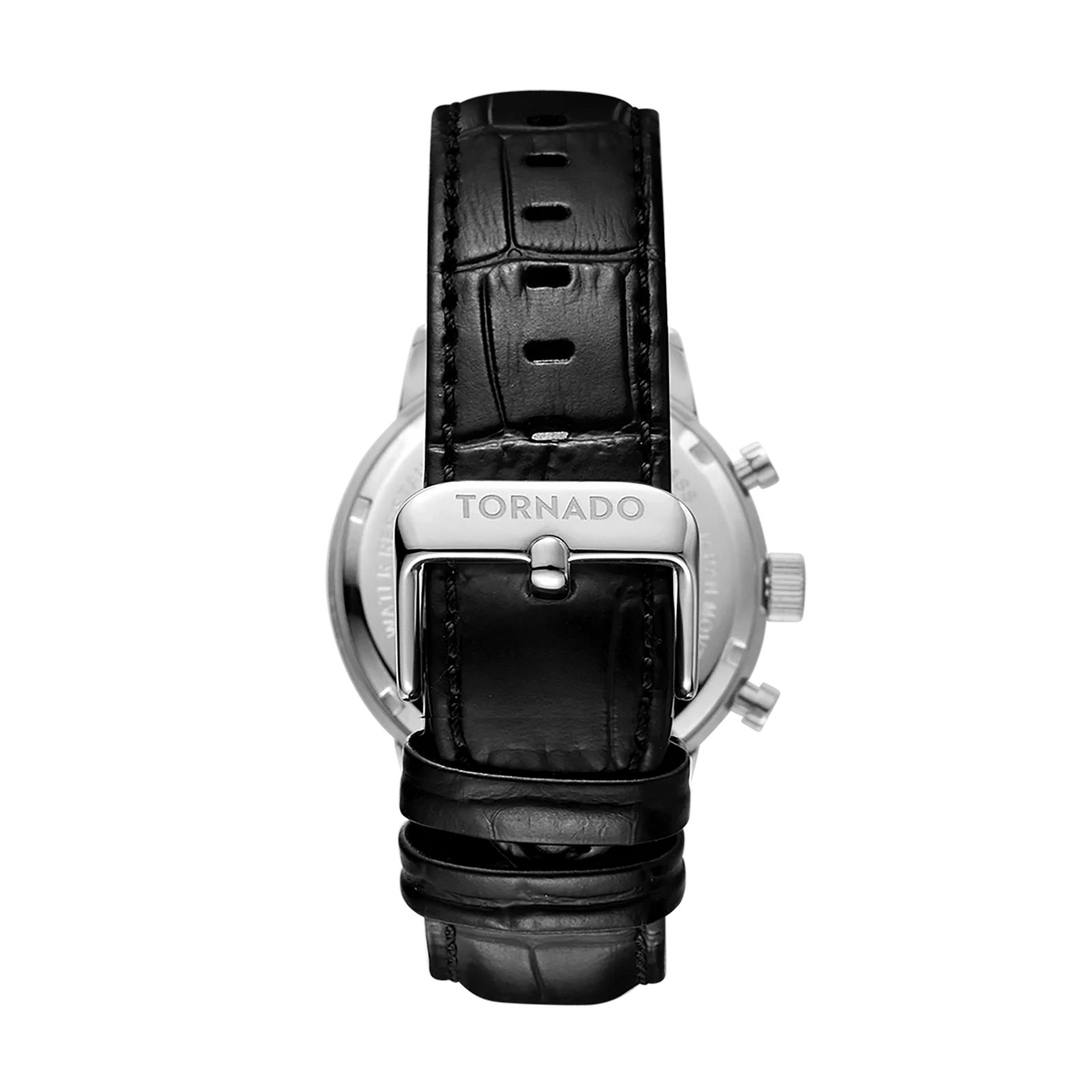 Tornado Celestia Elite's Chronograph Watch with white dial, silver case and black leather strap. Japan Quartz movement, sapphire coated glass, 10ATM water resistant. 3-year warranty included.