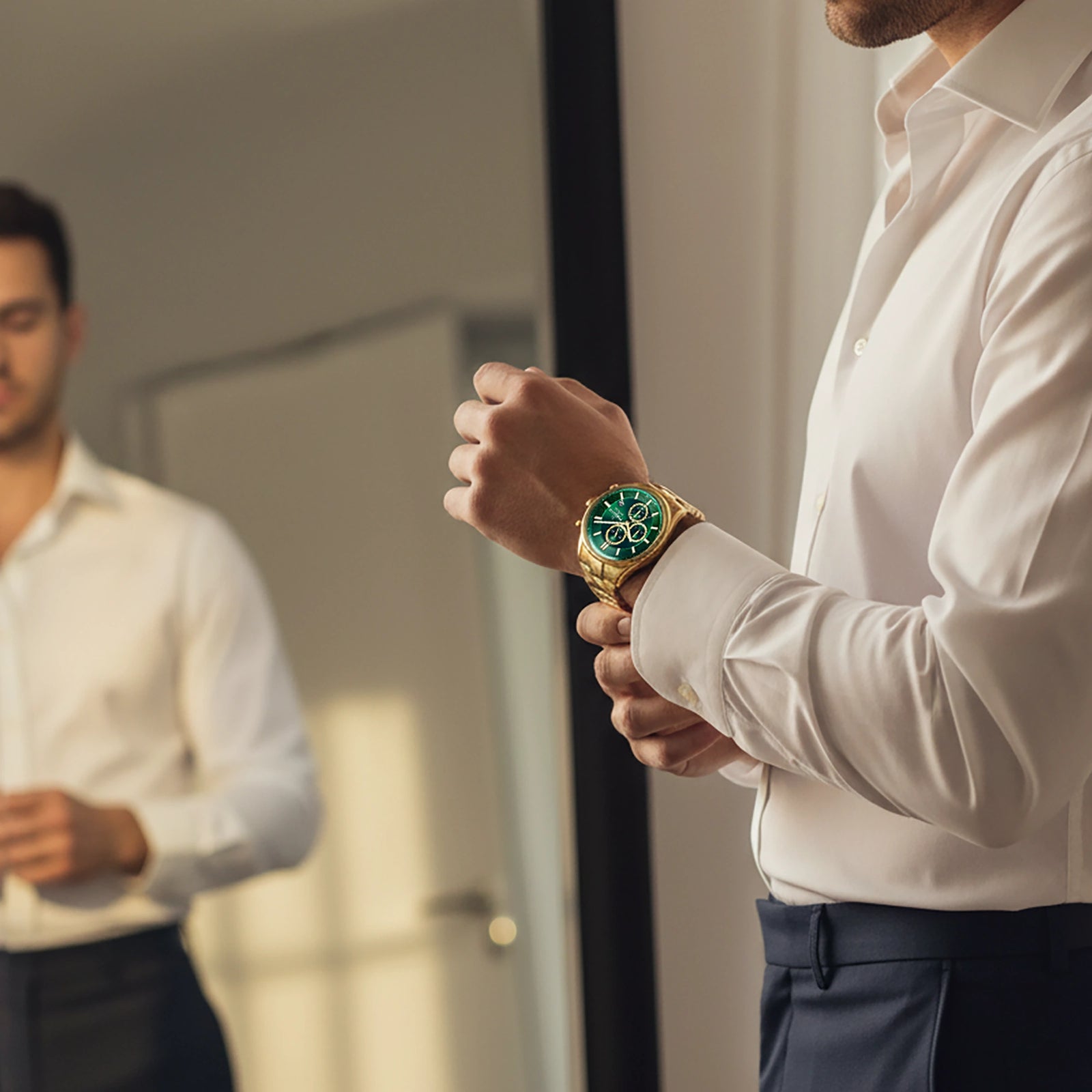 Tornado Celestia Elite's Chronograph Watch with green dial, gold case and strap. Japan Quartz movement, sapphire coated glass, 10ATM water resistant. 3-year warranty included.