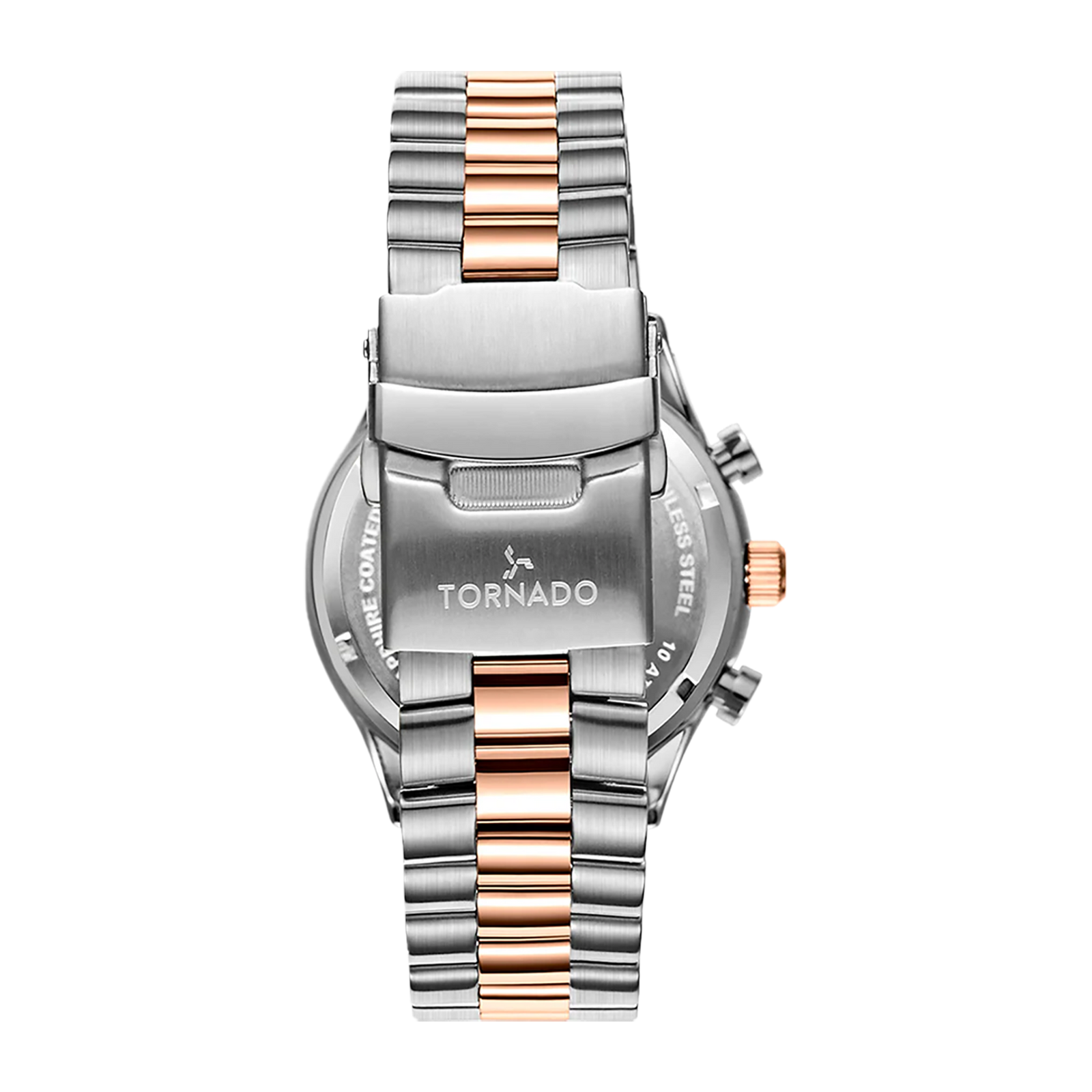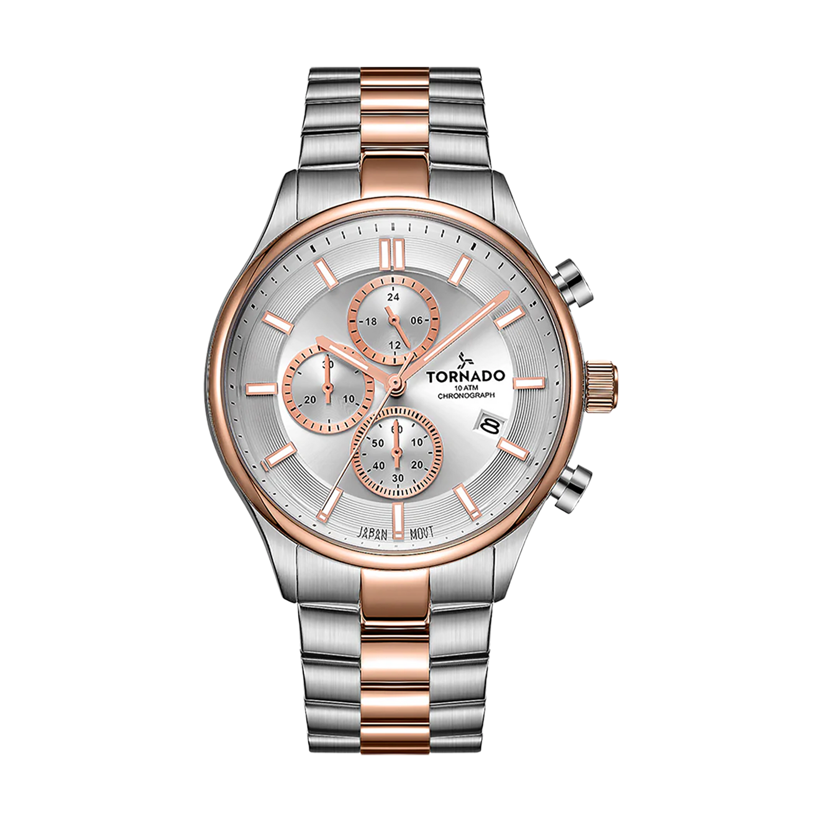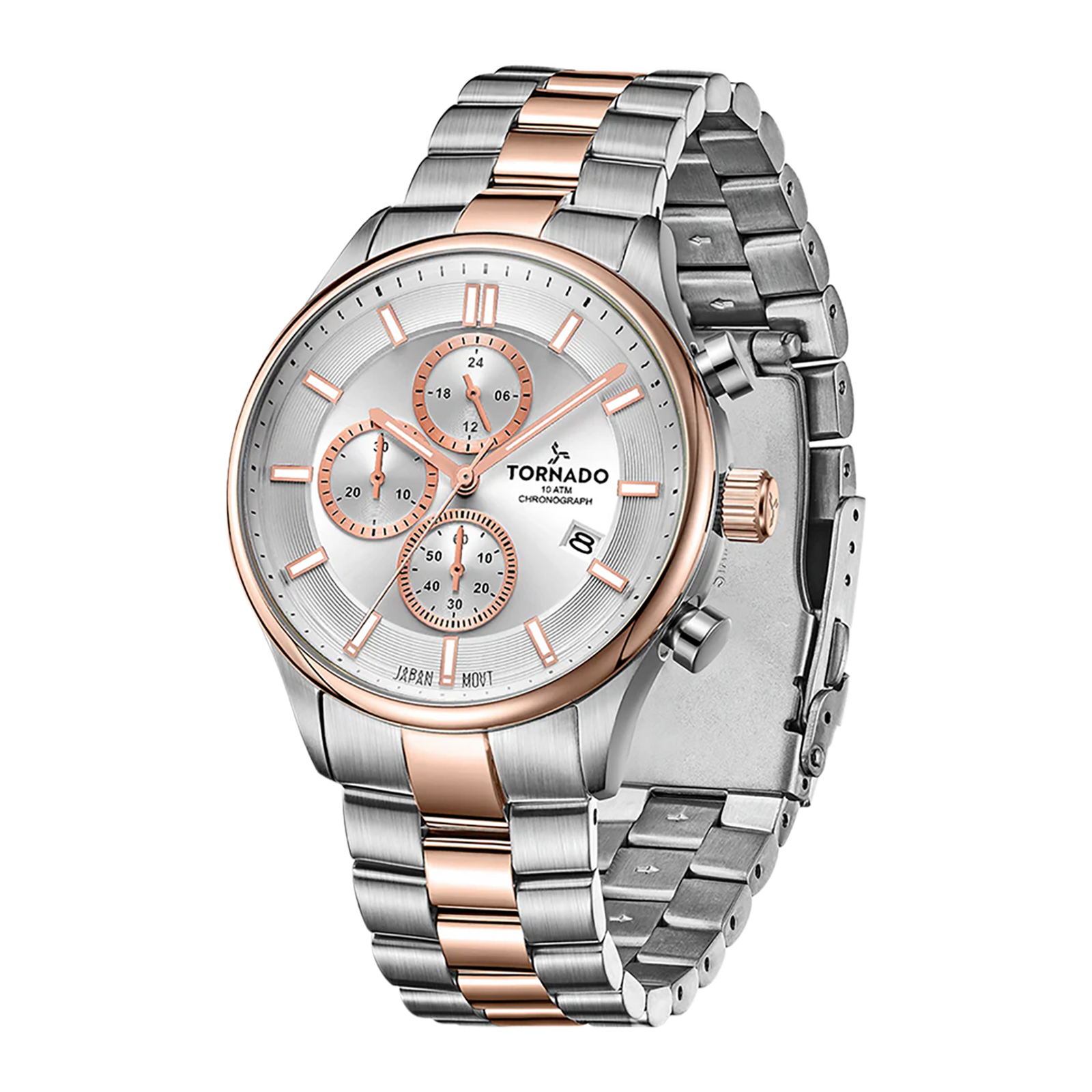 Tornado Celestia Elite Men's Chronograph Watch with white dial, silver/rose gold case and strap. Japan Quartz movement, sapphire coated glass, 10ATM water resistant. 3-year warranty included.