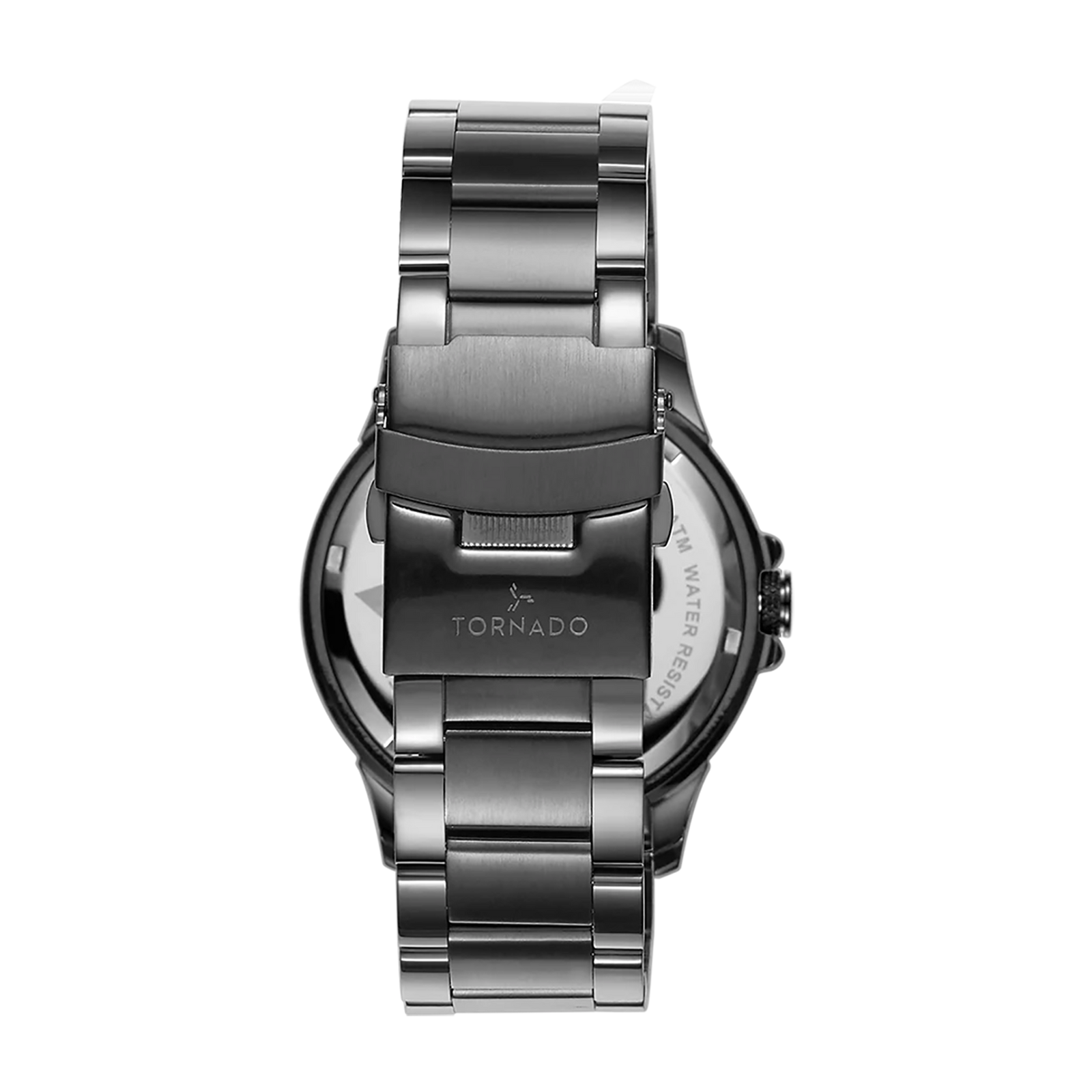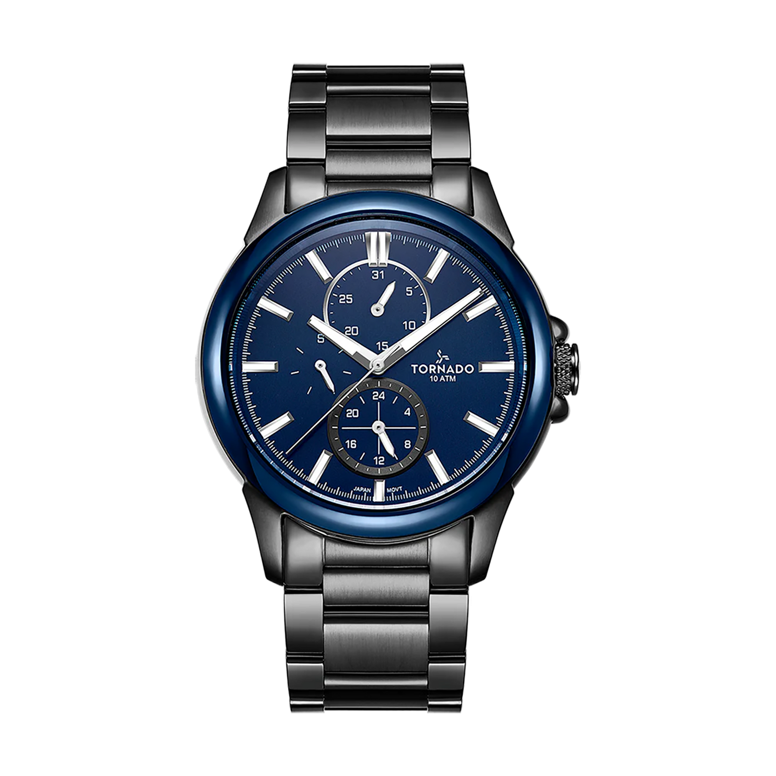 Tornado Celestia Elite Men's Multi Function Watch with blue dial, gunmetal case and strap. Japan Quartz movement, mineral glass, 10ATM water resistant. 3-year warranty included.