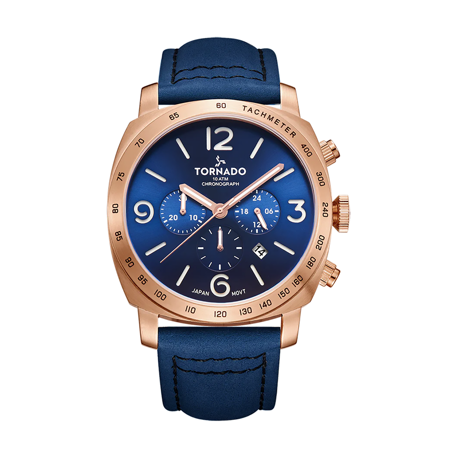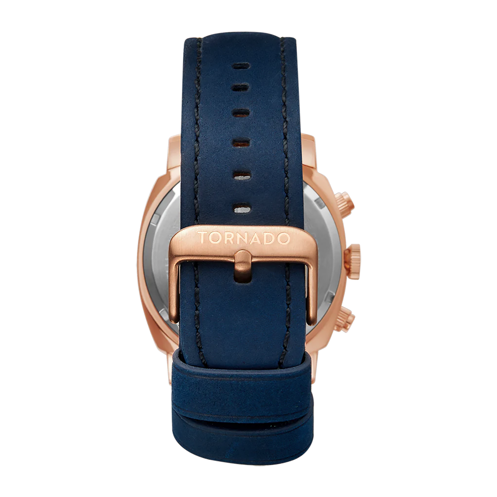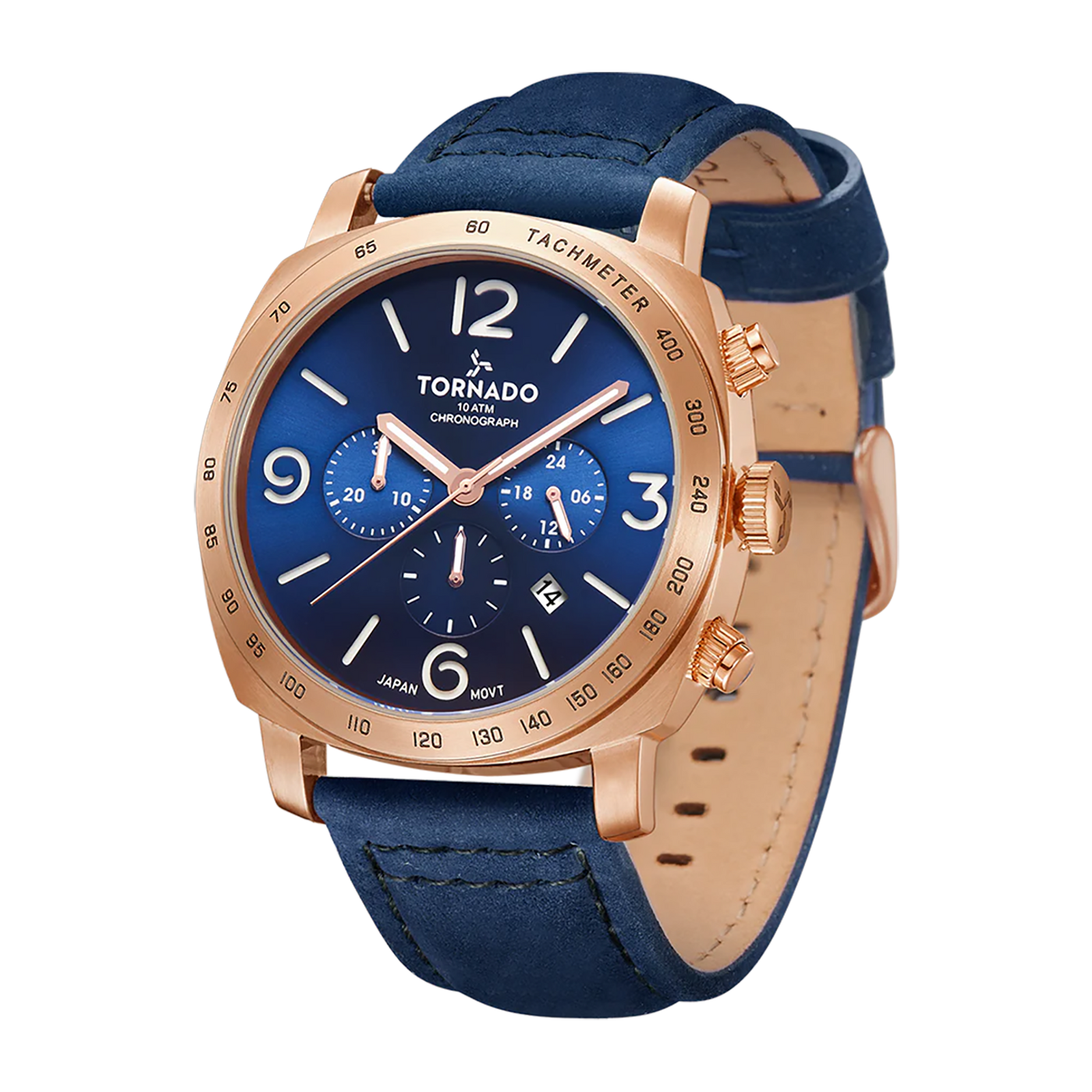 Chronograph watch with blue dial and rose gold case, paired with blue suede leather strap. Features Japanese quartz movement, sapphire-coated glass, and 10 ATM water resistance.