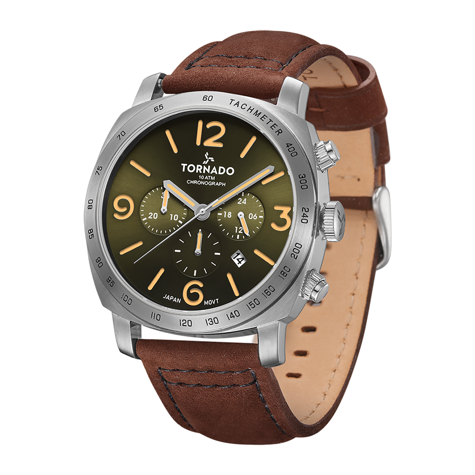 The LUMINA CHRONOSPHERE presents a classic-leaning expression of the design while retaining its bold case architecture. The 43 mm case is crafted from solid stainless steel with a brushed and polished silver finish, shaped in the collection’s distinctive square form with a round bezel. A dark-brown psuede leather strap adds warmth and texture, while establishing a vintage accent. The strap is sized at 24 x 22 mm and secured by a tang buckle, offering a comfortable fit. The green dial features a sunburst finish that shifts subtly with light, complemented by luminous hands and markers to ensure clear legibility in low-light conditions. The chronograph layout is neatly integrated, maintaining visual clarity without crowding the dial. At its core, the watch is powered by the Miyota JS25 chronograph movement, chosen for its consistent performance and reliability. Sapphire-coated glass protects the dial from scratches, while a 10 ATM water resistance rating supports everyday wear. Backed by a three-year warranty, the Lumina Chronosphere offers a modern design with a gentle classic touch.